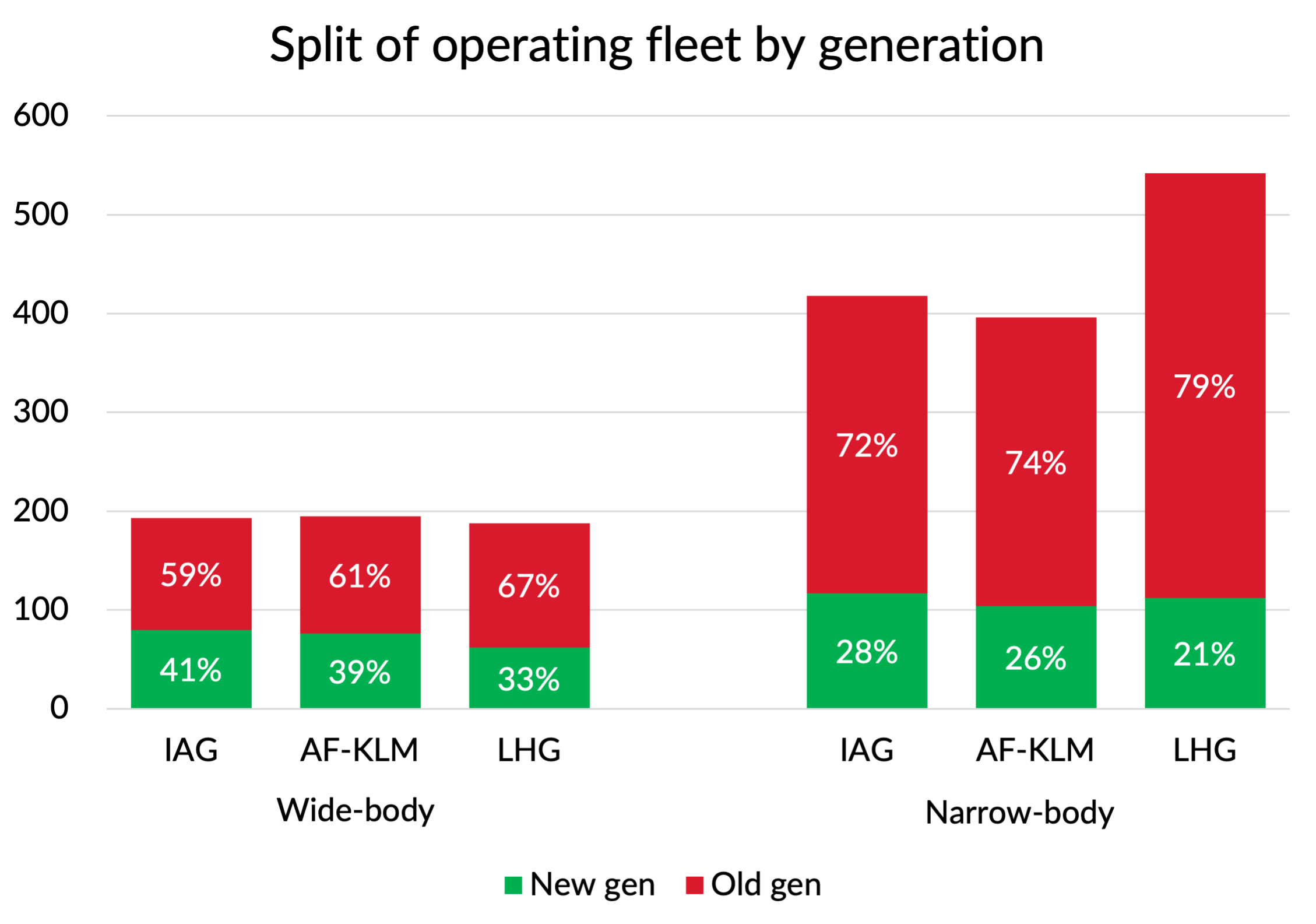 For both wide- and narrow-body aircraft, AF-KLM isn’t too far behind IAG, despite its balance sheet challenges.