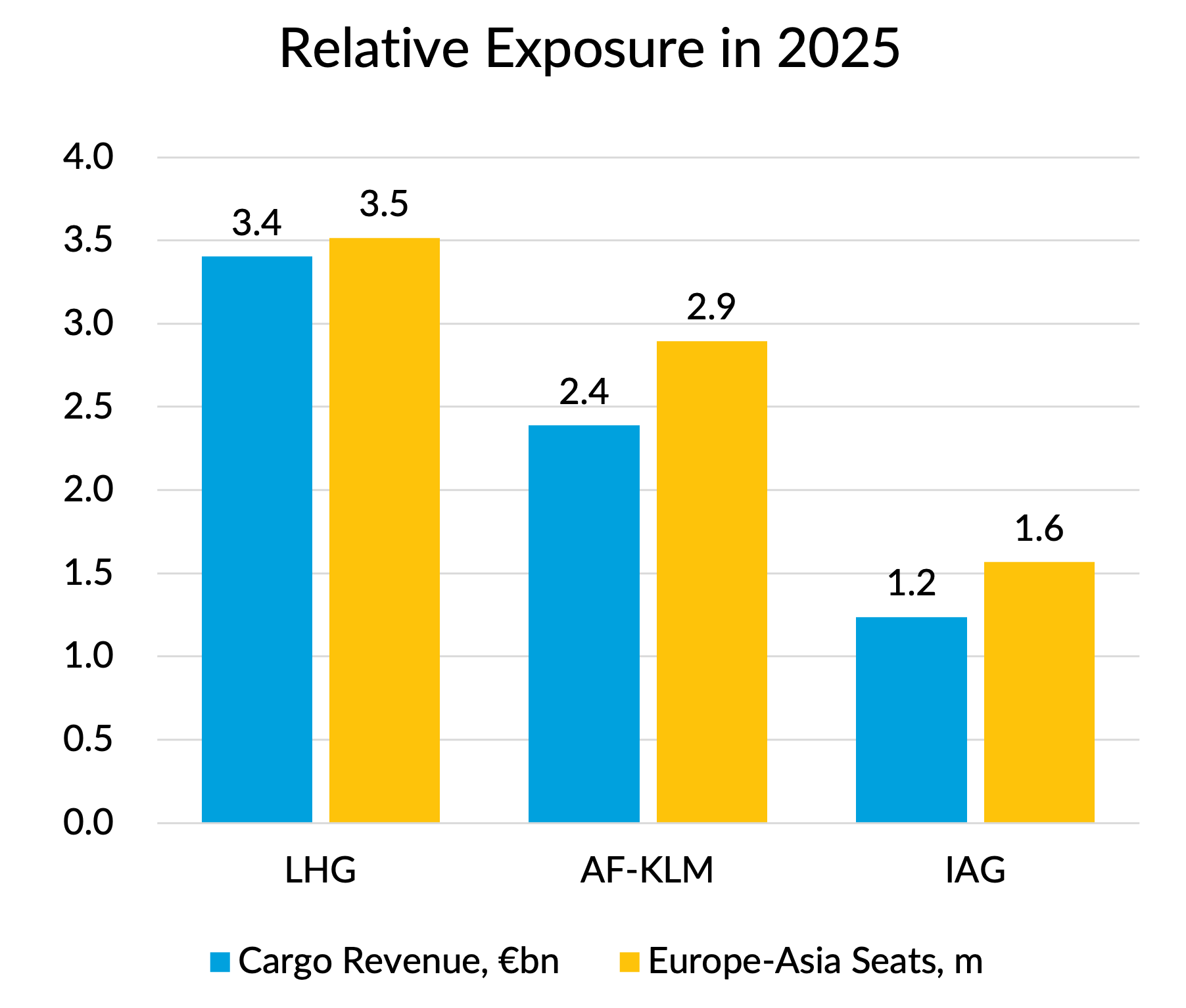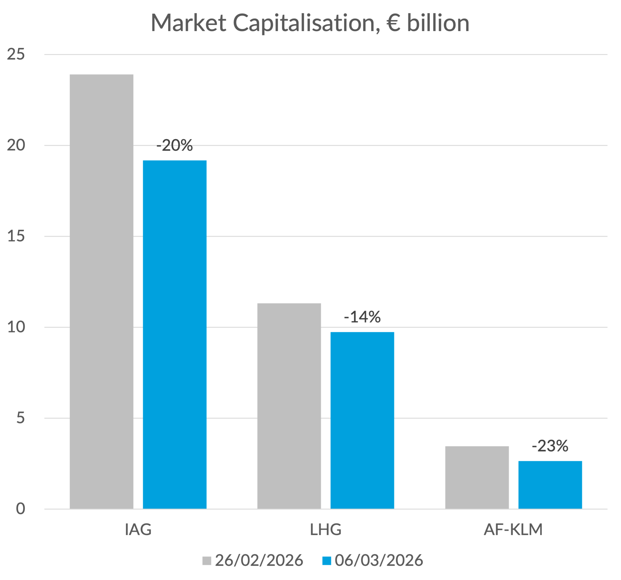 AF-KLM’s market capitalisation only dropped by €800m. Like Lufthansa, they have a fair amount of Asia capacity and a large cargo business. But the absolute value loss was also heavily constrained by the fact that their market capitalisation was only €3.5 billion to start with.