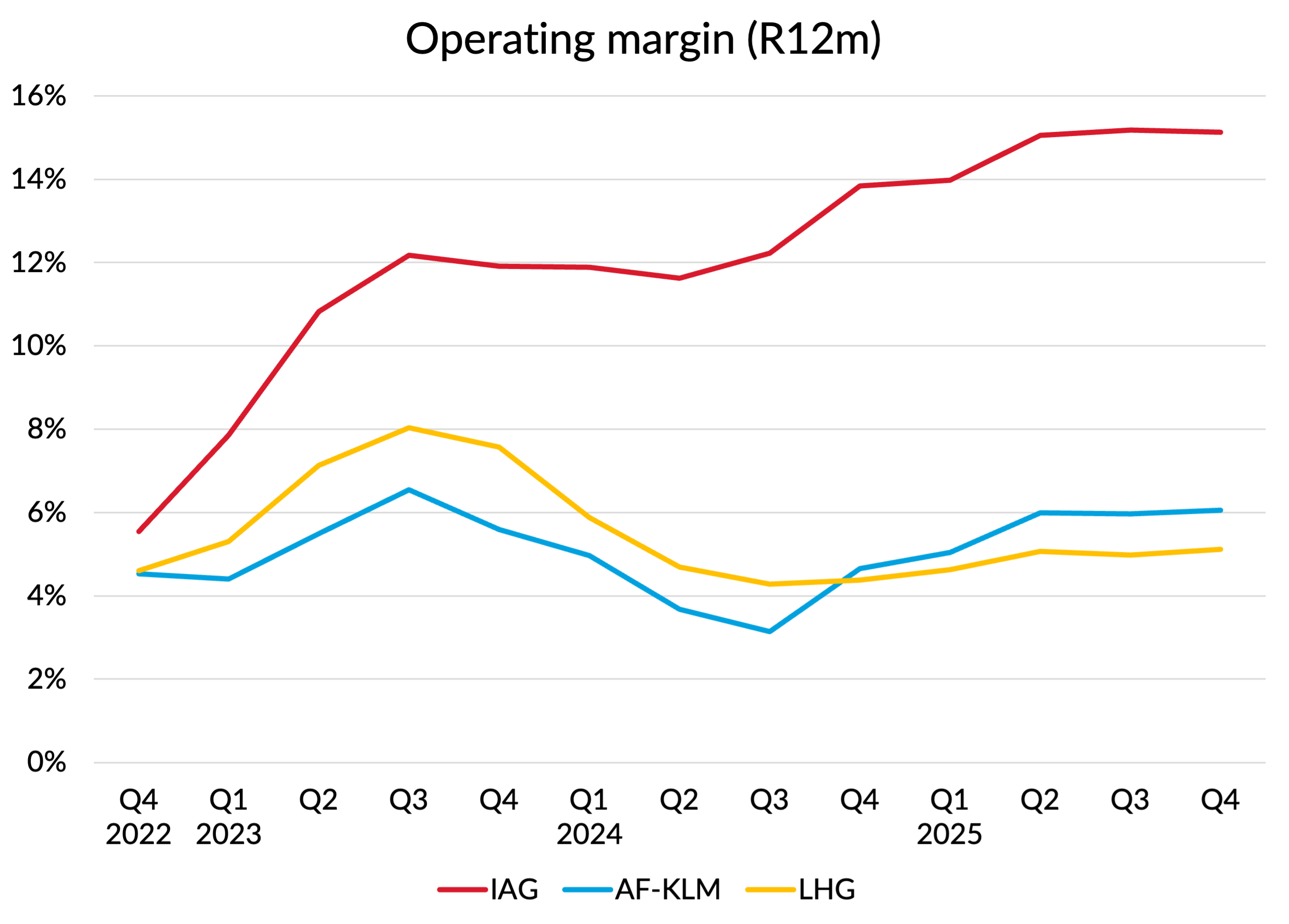 Margins have been quite stable at all three carriers recently, but IAG continues to lead the pack with more than double the level of profitability of the other two. Despite having a much more stretching target margin range (12-15%) than Lufthansa’s (8-10%) and AF-KLM’s (> 8%), IAG is already delivering performance at the top end of its target range, whilst the other two are still some way below the bottom of theirs.