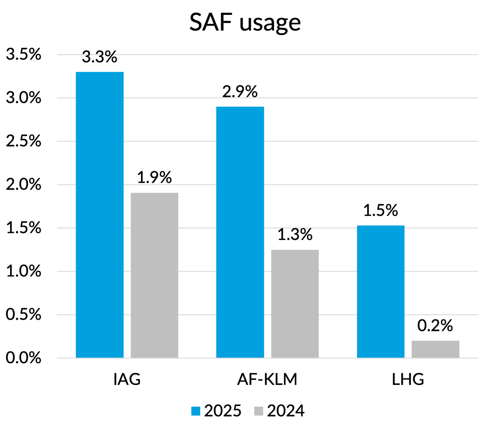 Before moving on to the outlook for 2026, I did want to share some interesting statistics disclosed by the carriers on their use of Sustainable Aviation Fuel (SAF) in 2025. All three groups significantly increased their use of SAF compared to 2024, in part in response to the introduction of SAF mandates in Europe. But despite a big jump compared to last year, Lufthansa Group remains the laggard of the three in terms of the percentage of their fuel use coming from SAF.