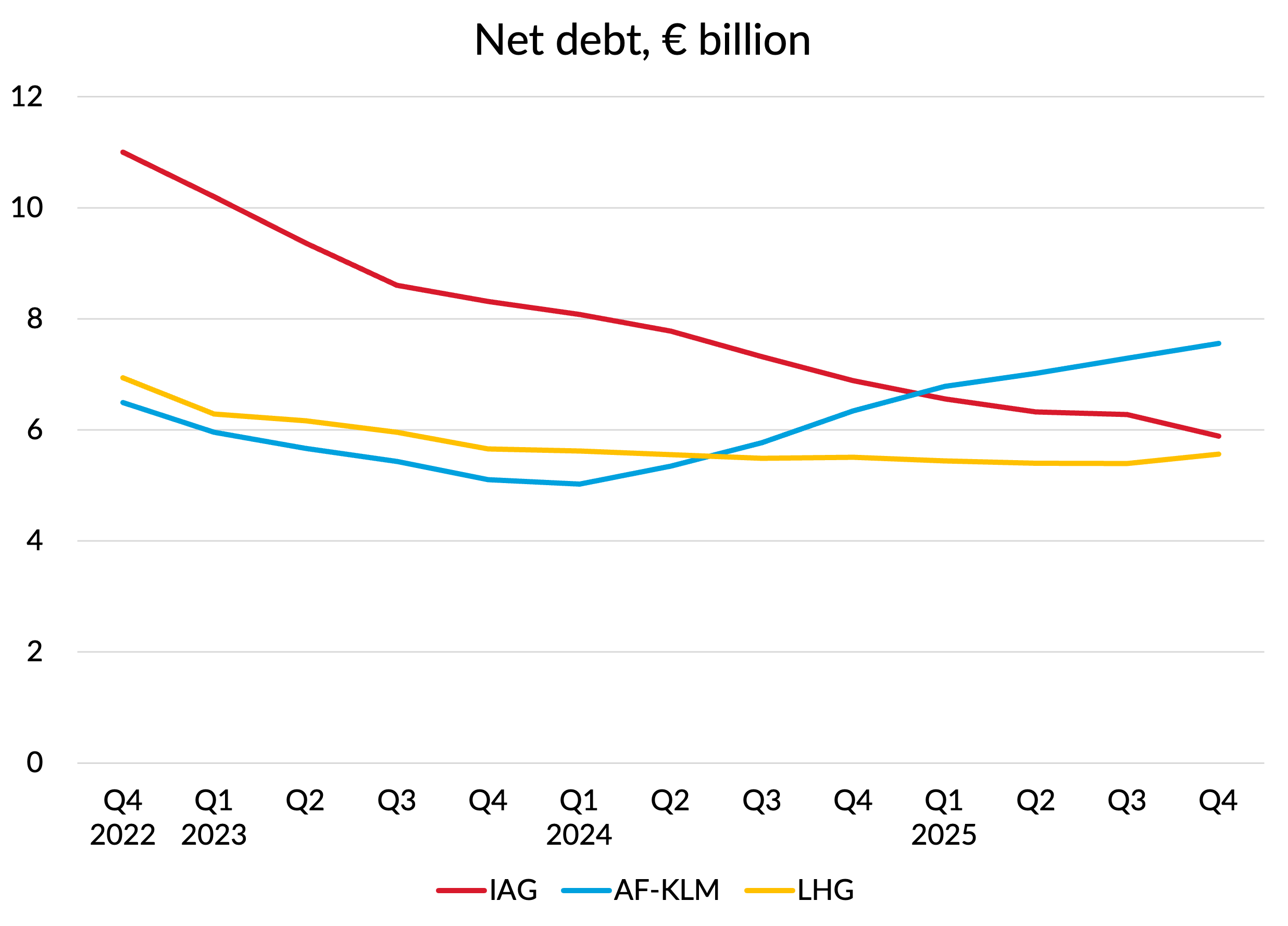 Despite making significantly larger payments to shareholders through a mixture of dividends and share buybacks, IAG’s superior profitability has enabled it to reduce its net debt much faster over the last few years, a trend which continued into the final quarter of 2025.
